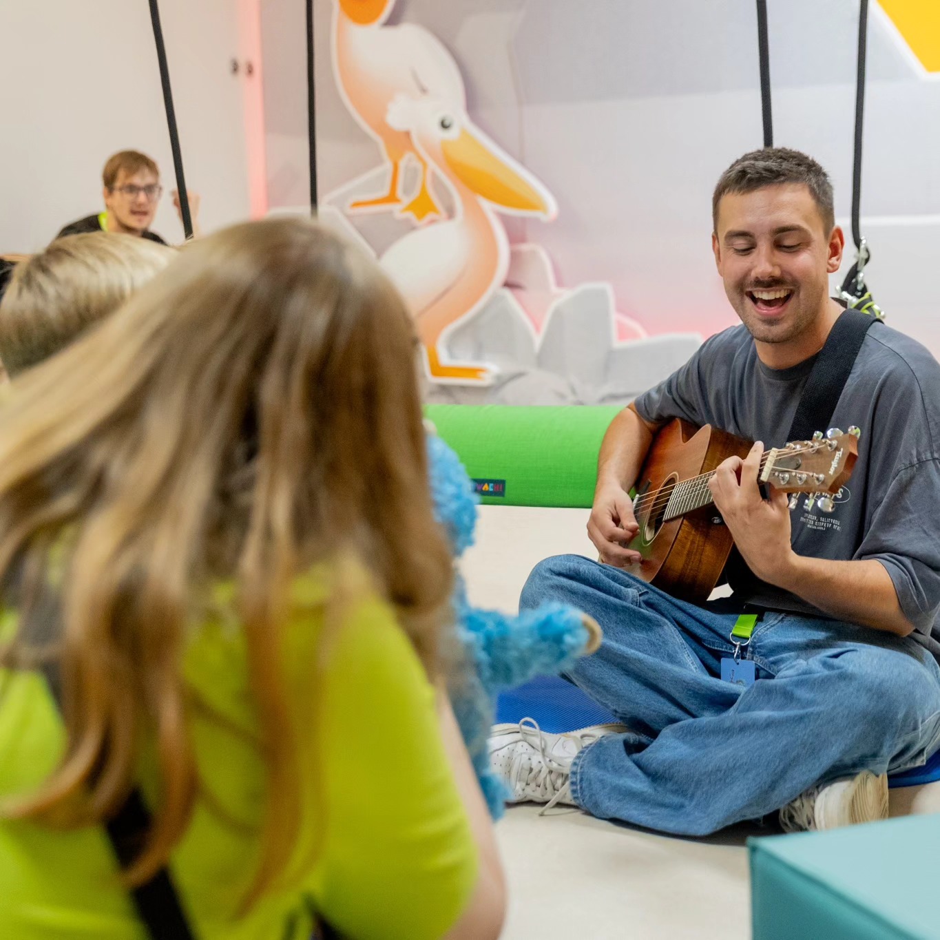 Die Zeit am Vormittag vergeht wie im Flug, alles steht für die Konzerte bereit und pssst nun sind auch unsere heutigen Künstler*innen angekommen. Für uns spielen heute ela. und Sebastian Wurth! Wir freuen uns riesig, dass sie uns gemeinsam ihre Kinderklinikkonzerte Premiere geben. Los geht es mit der ersten Station! Ela und Basti spielen ein Konzert im Garten der Stationen der Kinder- und Jugendpsychiatrie. Unter freiem Himmel eine besondere Atmosphäre. Es folgt das nächste Konzert im hauseigenen Toni Kroos Raum. Die Stiftung unterstützt nicht nur uns das dritte Jahr in Folge, sondern führt auch eine Partnerschaft mit dem Clemenshospital in Münster. Unser gemeinsames Ziel, Lebensfreude zu schenken, verbindet uns. Dann folgen noch vier weitere Konzerte, unter anderem in der Cafeteria mit ambulanten Patient*innen und ihren Familien, auf der Intensivstation und auch ganz persönlich am Krankenbett. Wir erleben ganz besondere Momente und sind zu Tränen gerührt, als Basti einen ruhigen bewegenden Song am Bett eines Jungen spielt, der zwar seine Reaktion nicht durch Sprache mitteilen kann, aber mit seinem Körper zeigt. Er wird ganz ruhig, seine Mama weint. Ein Moment, der Kraft schenkt.