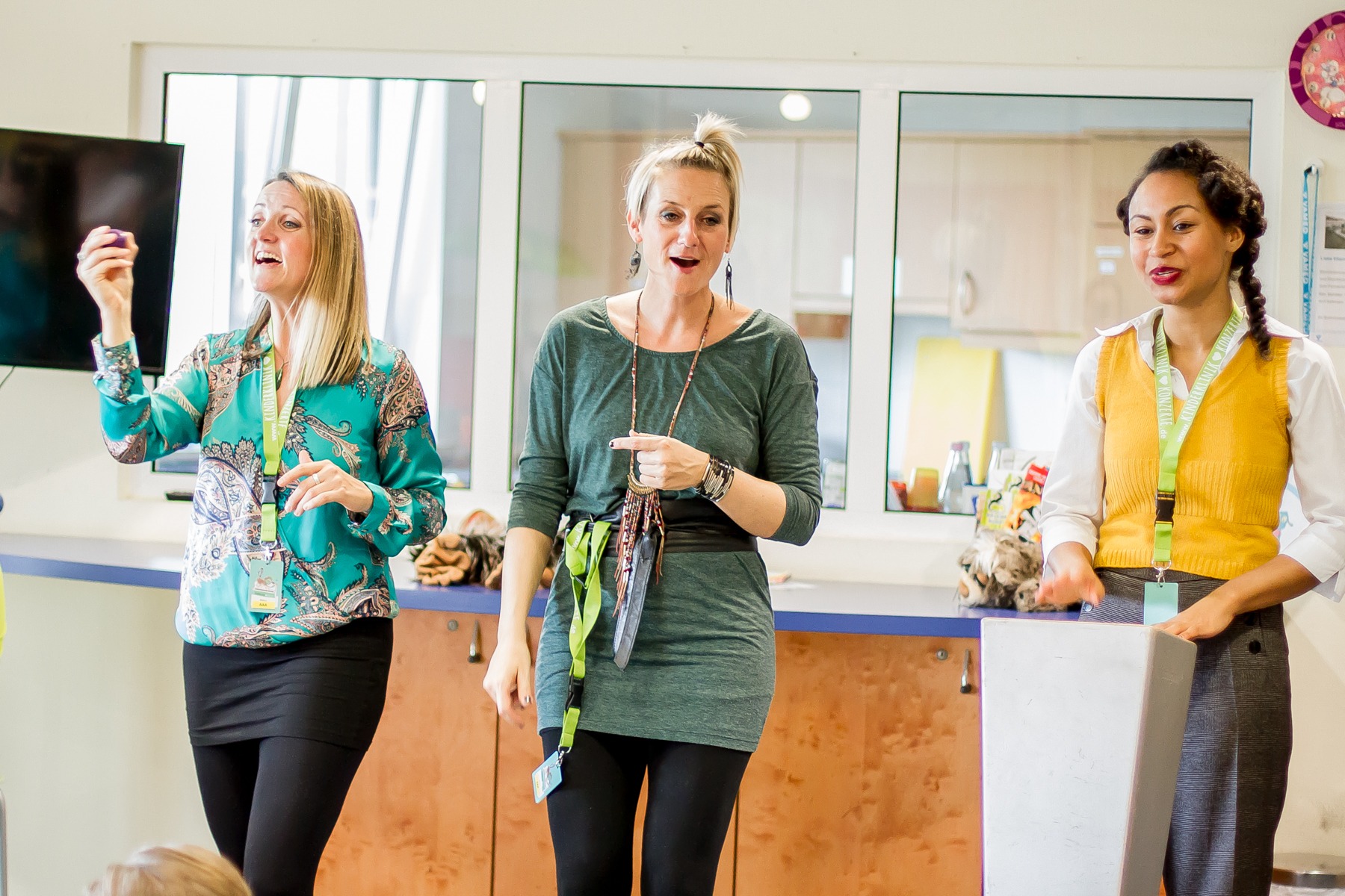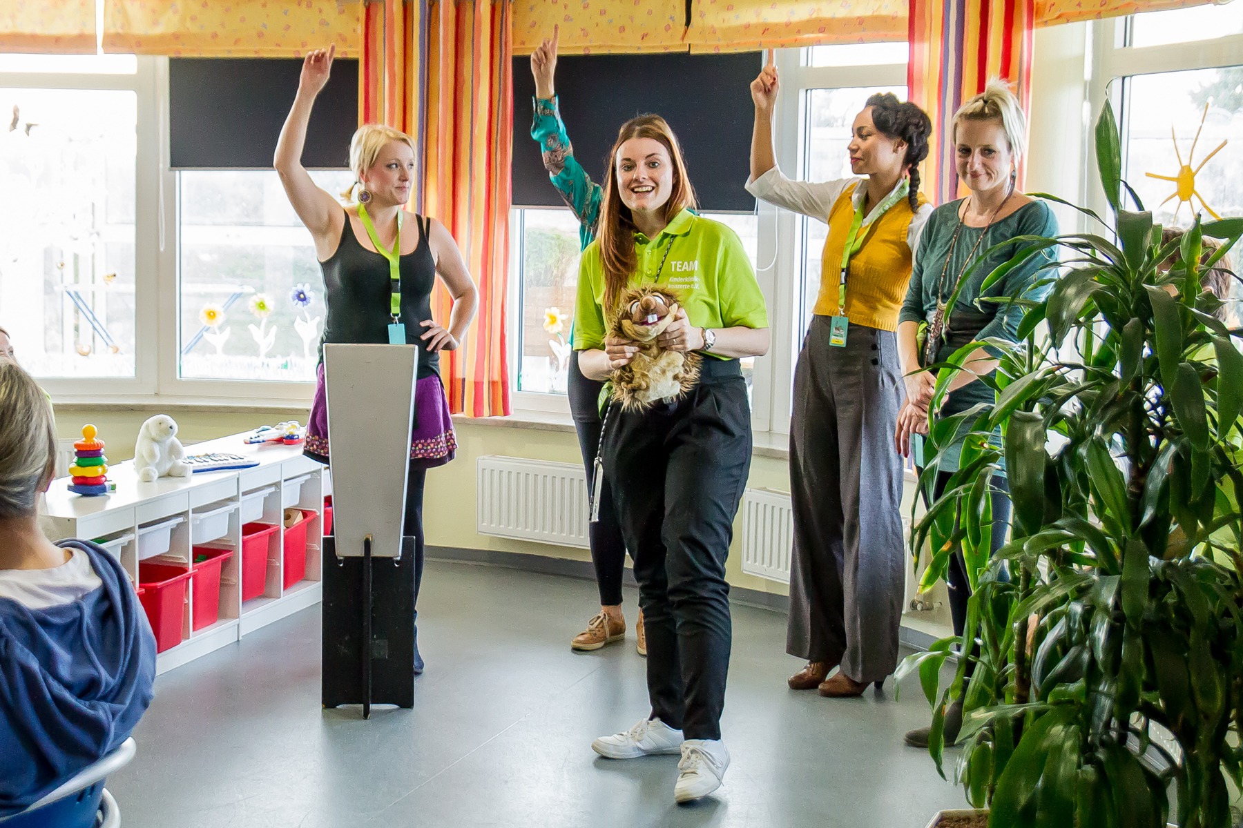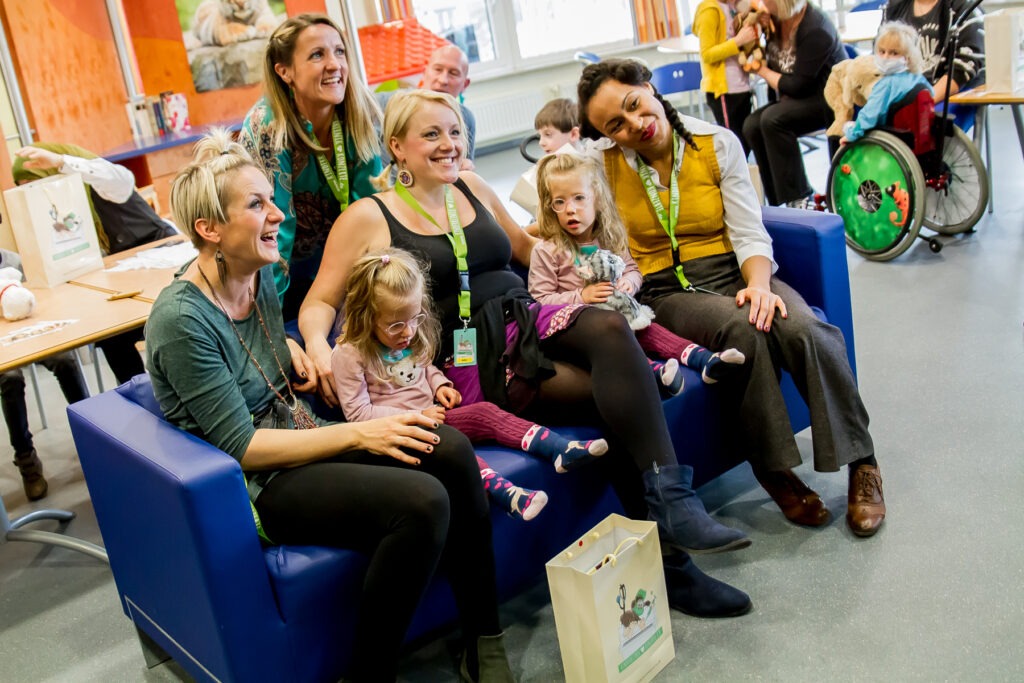 Schon bald kamen auch die Künstlerinnen des Tages. Unsere Vereinspatinnen, die A-cappella-Band „medlz“, spielten das 21. und ihr 8. Kinderklinikkonzert. Nicht nur deswegen war die Stimmung von Anfang an vertraut und entspannt. Die „medlz“ kannten die Abläufe und waren mit dem Konzept mehr als vertraut. Insgesamt sollten an diesem Tag 5 verschiedene Stationen besucht werden. Die Liederauswahl reichte von bekannten Kinderliedern, über deutsche Popmusik bis hin zu englischsprachigen Klassikern. An diesem Konzerttag konnte man sehr gut erkennen, dass auch nach vielen gemeinsamen Konzerten, keine Normalität einkehrt. Jedes Konzert ist besonders und durch die kleinen Zuhörer ganz individuell. Ob bei den einzelnen Teammitgliedern, als auch seitens der Band, waren die Emotionen von der ersten Station an deutlich spürbar. Die kleinen Patienten, ihre Eltern und Geschwister waren begeistert von der Musik, die so ganz ohne Instrumente gemacht werden konnte. Es wurde freudig getanzt, gelacht und geklatscht. Die kleine Auszeit ist gelungen. Einmal abschalten, ausbrechen aus dem Klinikalltag. Die Diagnose und deren Beschwerden mal für einen kurzen Moment vergessen. Zum Abschluss wurden natürlich auch diesmal wieder, die liebevoll gepackten Geschenktüten von uns überreicht. Das Leuchten in den Augen der Kinder, war nach der Ankündigung, nicht zu übersehen und sie konnten es kaum erwarten sie entgegenzunehmen. Nach jeder einzelnen Station, nahmen sich die „medlz“ Zeit für gemeinsame Erinnerungsfotos, Autogramme und Gespräche. Nicht nur die Kids und deren Angehörige, sondern auch das Klinikpersonal war begeistert.