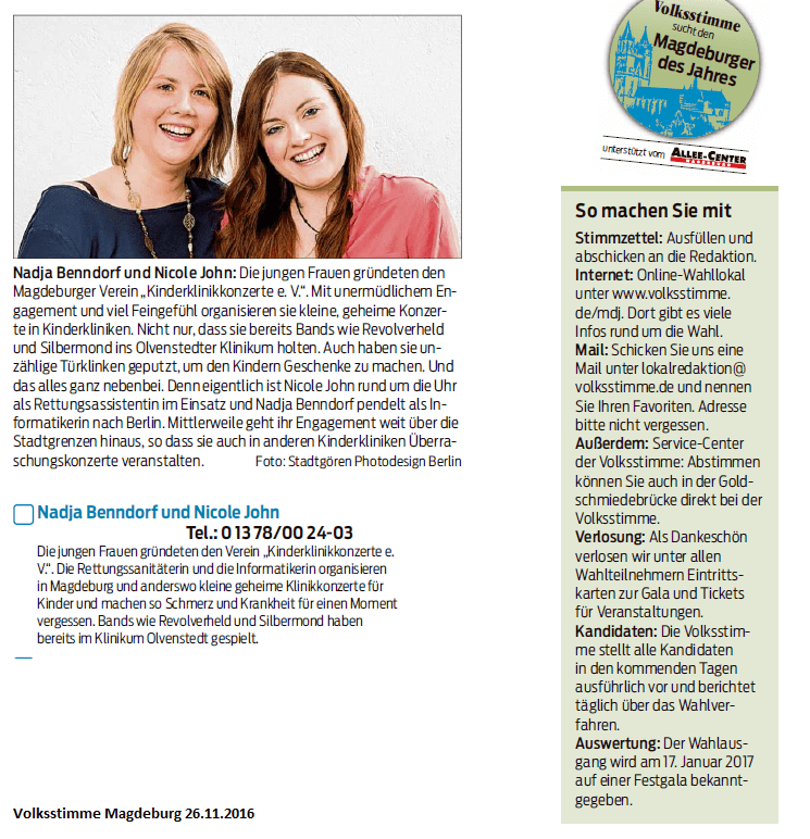 Es ist eine riesen Ehre für uns. Nadja und Nicole sind stellvertretend für unseren Verein als “Magdeburger des Jahres” 2016 nominiert. Ihr könnt jetzt z.B. unter www.volksstimme.de/magdeburgerdesjahres oder telefonisch unter 01378/ 00 24- 03 (0,50€ pro Anruf aus dem deut.Festnetz/ mobil deutl. teurer) für die beiden abstimmen.