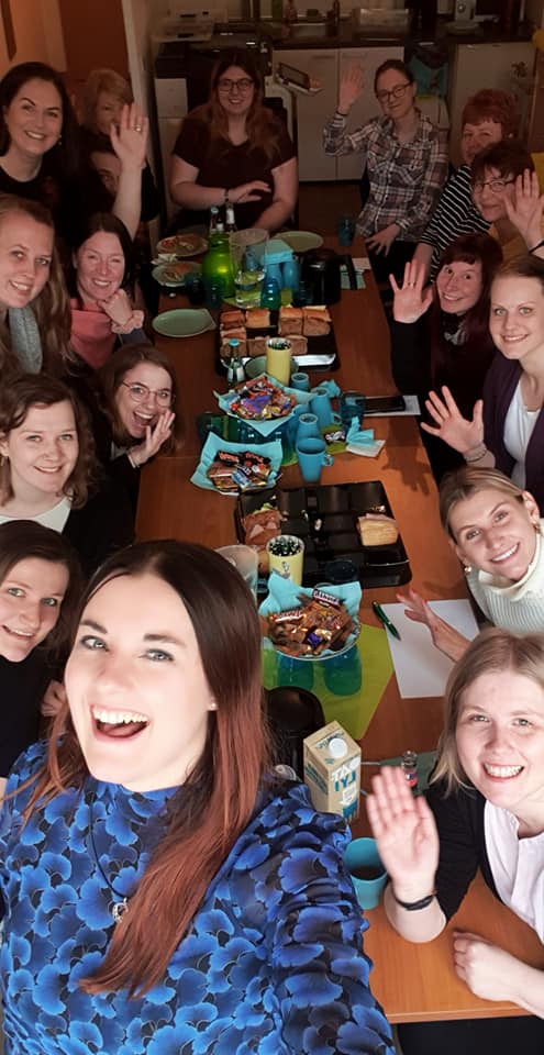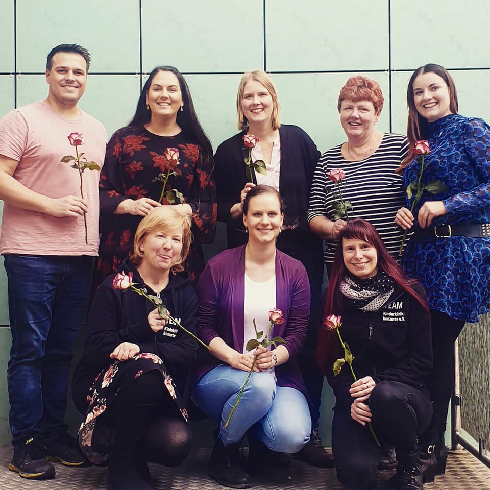 Neben unseren Vorstandsvorsitzenden Nadja und Nicole ist auch Katharina (in Elternzeit und daher nicht auf dem Bild) seit 9 Jahren dabei, Anja seit 7 Jahren, Jenny & Markus, Sven sowie Patrick (diese beiden Jungs sind ebenfalls nicht auf dem Bild) sind seit 2014 dabei und Anika, Manu und Katrin bereichern mit ihrem großartigen Engagement seit 2015 die Kinderklinikkonzerte. Neben Blümchen gab es für alle einen Konzertgutschein. Wir organisieren tagein tagaus Konzerte für die kleinen Patienten und schaffen es oft selbst kaum auch einmal privat Konzerte zu besuchen. Mit den Worten: “Denkt auch einfach mal einen Abend nur an euch und feiert euer tolles Engagement.”, überreichten Nicole und Nadja die kleinen Geschenke an ihr Team.