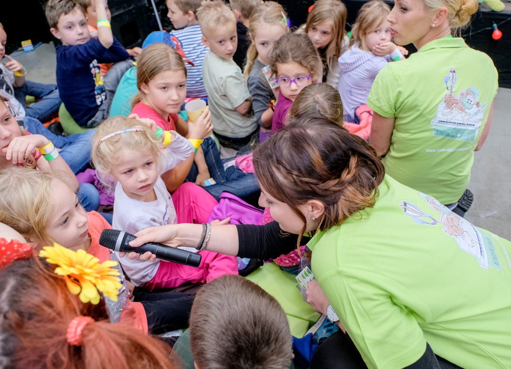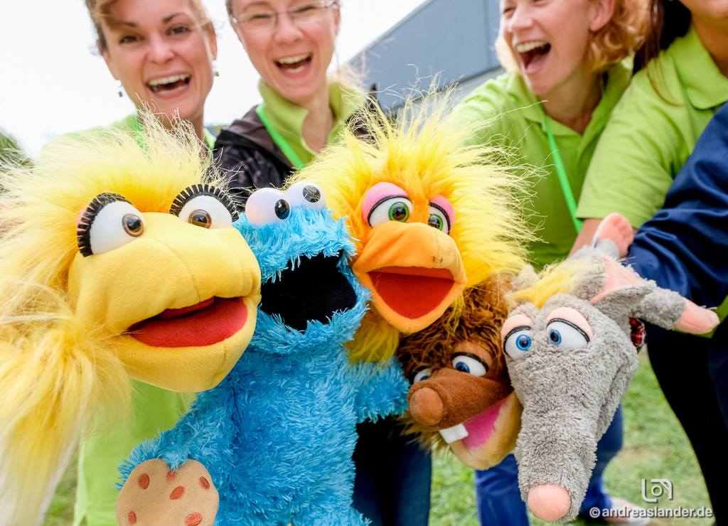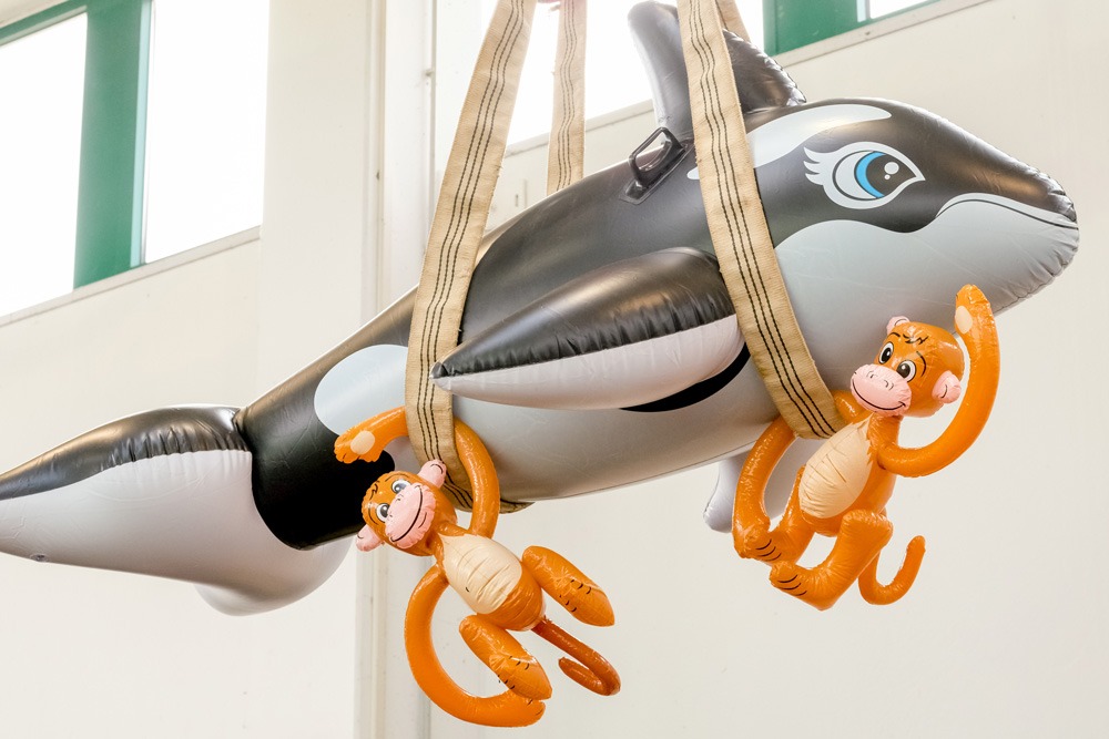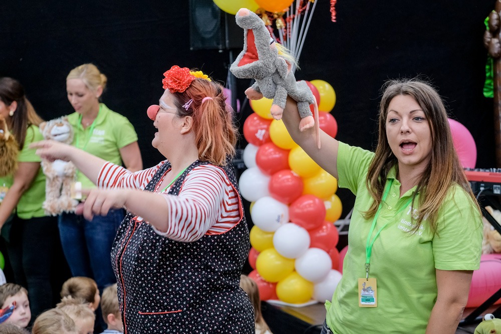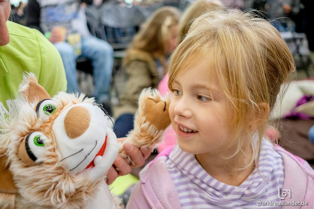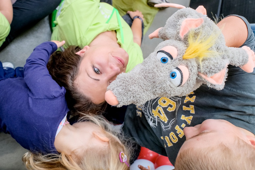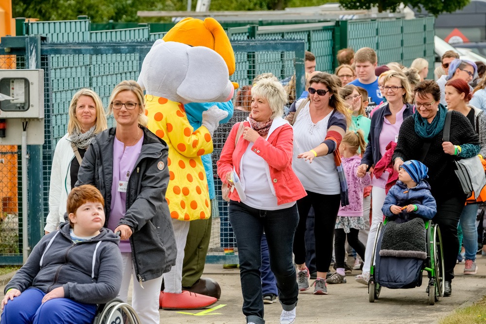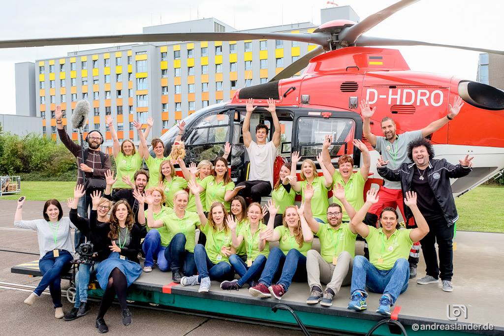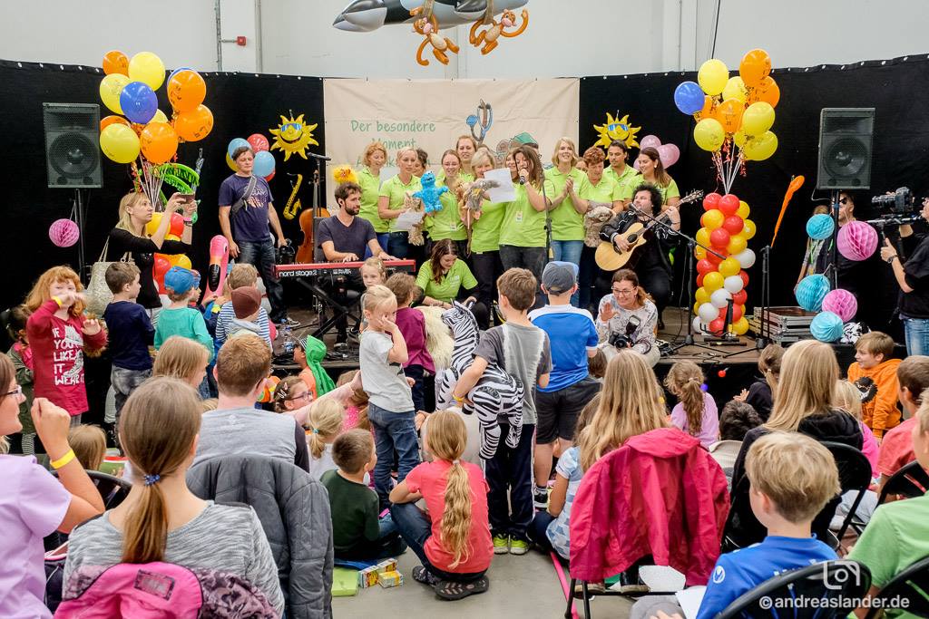 Während die Bühne nach und nach ihre Form annahm, kümmerte ich mich mit einigen Vereinsmitgliedern um den dekorativen Part der Bühnengestaltung. Dafür durften natürlich unsere aufblasbaren Äffchen und Luftgitarren nicht fehlen. Mit dabei in diesem Jahr der Wal „Free Willy“, welchen wir wie hier zu sehen, in einer heroischen Aktion direkt über der Bühne platzierten. Nach all den Vorbereitungen war es um 14:30 Uhr endlich Zeit, die Kinder in den dekorierten Hangar zu führen. Mit dabei waren in diesem Jahr neben Patienten des Klinikums Magdeburg und der Ameos Klinik in Schönebeck ebenfalls Kinder aus dem Kinderhospiz, aus umliegenden Kinder- und Jugendheimen sowie der Verein schwerstkranker Kinder & ihrer Eltern e.V. und der Förderkreis krebskranker Kinder e.V.. Bereits hier war es schön, die Überraschung in den Augen der Kinder zu sehen. Denn eine so bunt dekorierte Bühne bekommt man nicht alle Tage zu Gesicht. Erst recht nicht dort, wo normalerweise ein Rettungshubschrauber untergebracht ist. Zudem platzten die Kleinen fast vor Neugier. Denn wie immer hielten wir den Künstler des Kinderklinikkonzertes bis zuletzt geheim.