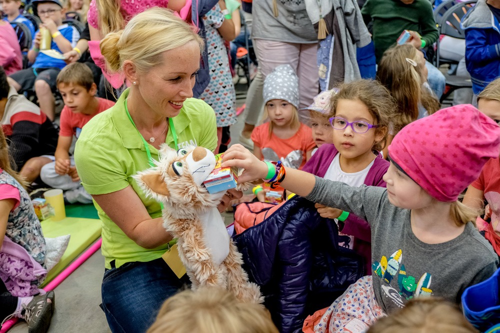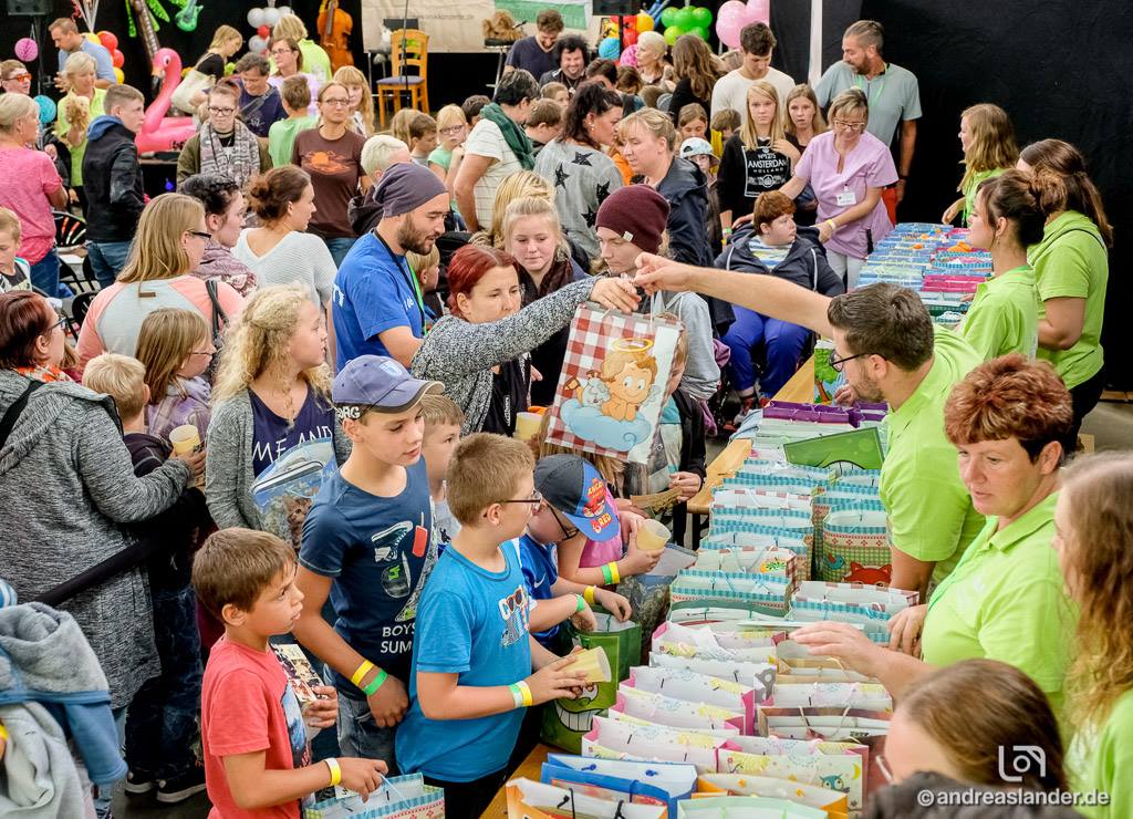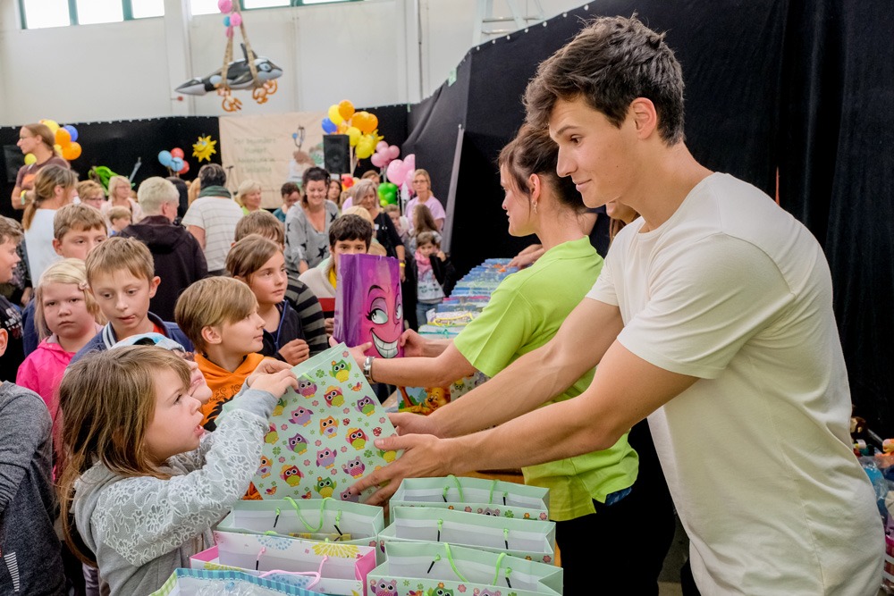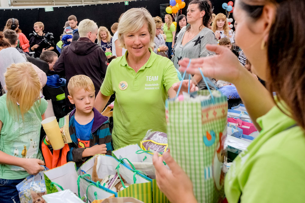 Nun war der Moment gekommen, der wie immer ein weiteres Highlight jedes Kinderklinikkonzertes darstellt. Die Vergabe der Geschenktüten, welche nur durch die wunderbaren Sachspenden zahlreicher Firmen möglich ist. Und für die kleinen Patienten ist es immer ganz besonders, eine der Geschenktüten überreicht zu bekommen, hineinzuschauen und zu erkunden, was sich alles darin befindet. Zudem ist es ein kleines Andenken, was sie noch lange Zeit an das Kinderklinikkonzert erinnern wird. Natürlich ließen es sich die Musiker nicht nehmen, fleißig mit uns die Geschenktüten zu verteilen und den Kindern so die Möglichkeit zu geben, noch einmal ganz nah an ihren Stars zu sein.